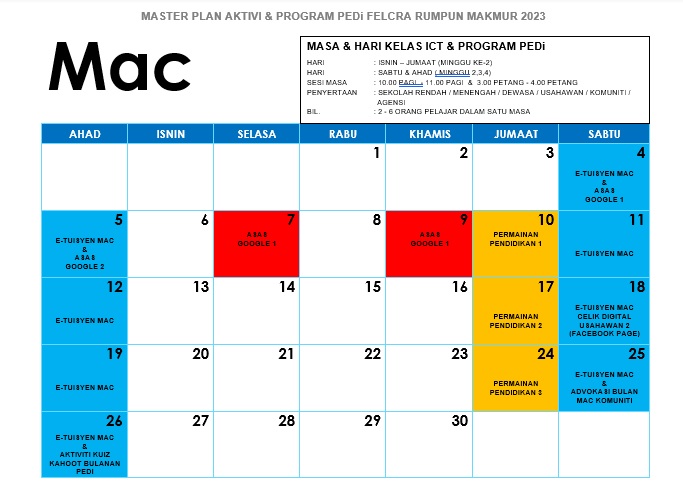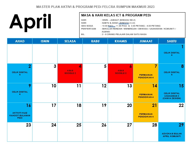 TARIKH : APRIL 2023 MASA : 10.00-4.00 PETANG LOKASI : PEDI FELCRA RUMPUN MAKMUR PESERTA : 6 ORANG TUJUAN aktiviti yang memberikan pendedahan kepada pengguna untuk mengakses internet menggunakan komputer, perisian microsoft work untuk […]